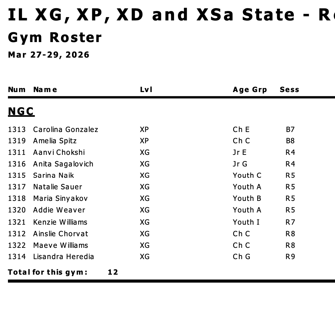 11:00am Open Stretch (arrive by 10:40am) Xcel Gold (10) Natalie Sauer, Sarina Naik, Maria Sinyakov, Kenzie Williams, Anita Sagalovich, Addie Weaver, Ainslie Chorvat, Maeve Williams, Lisandra Heredia, Amoli Purwar