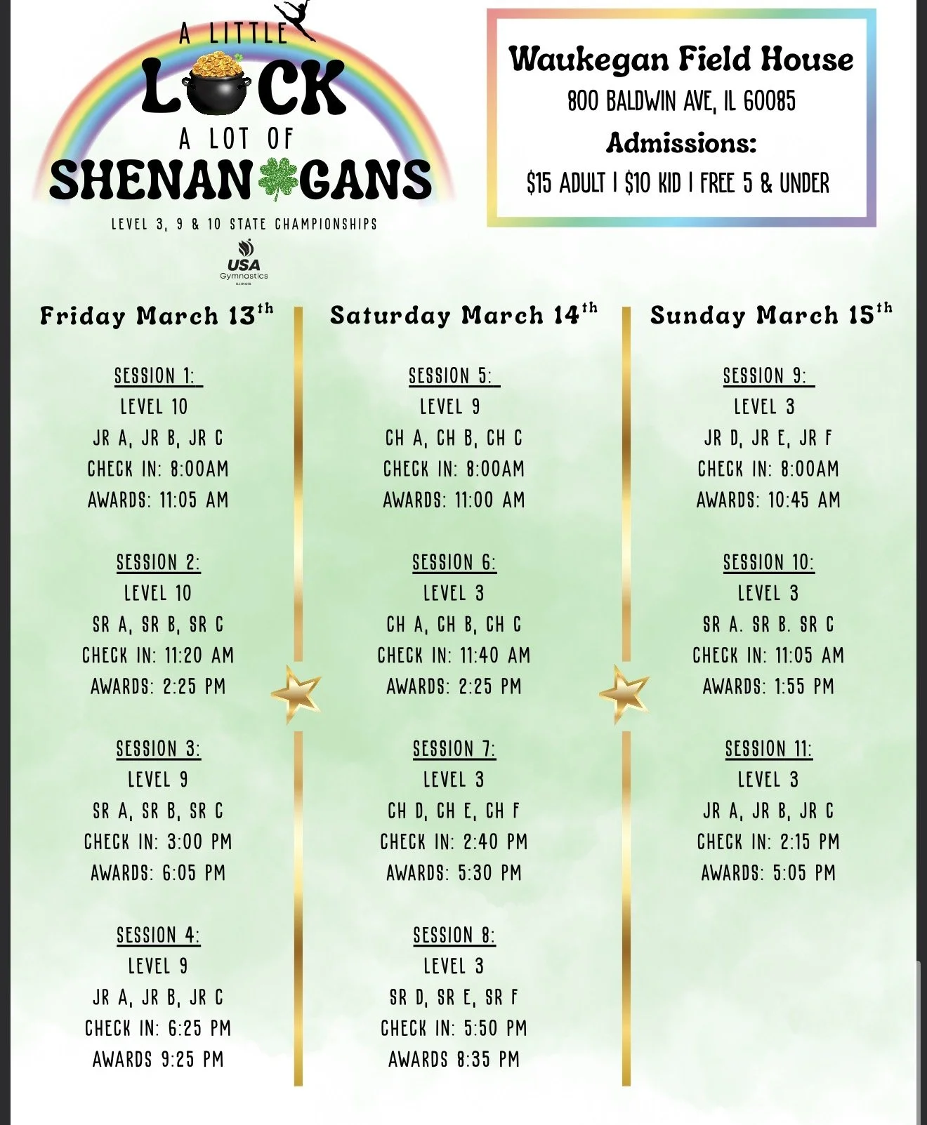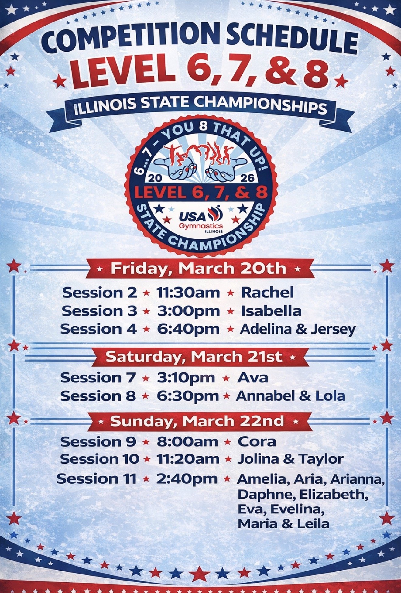 6:00pm Open Stretch (arrive 5:40pm) Level 7, 8 & 9 (5) Adelina Panis, Jersey Winter, Rachel Wozniak, Isabella Farkas, Alexa McCoy