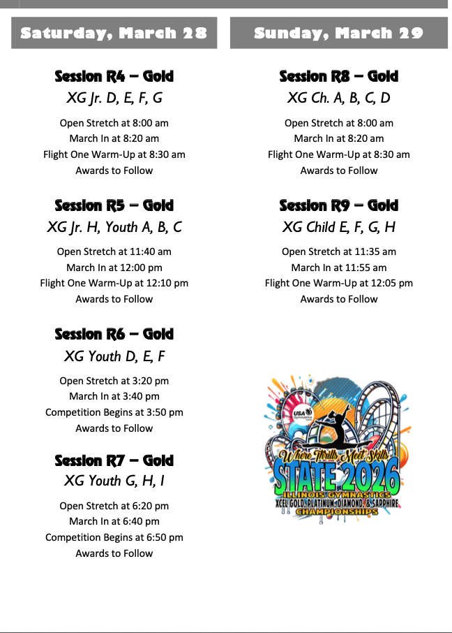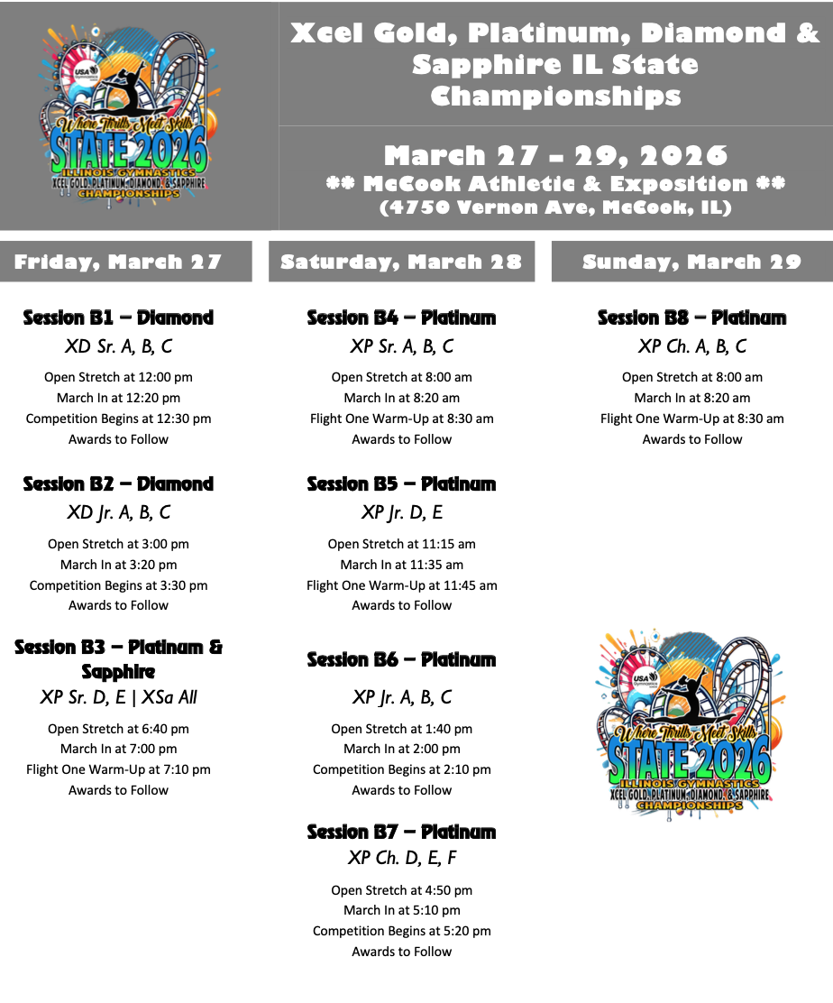 1:30pm Open Stretch (arrive by 1:10pm) Xcel Bronze (10) & Xcel Silver (10) SPLIT 10/10