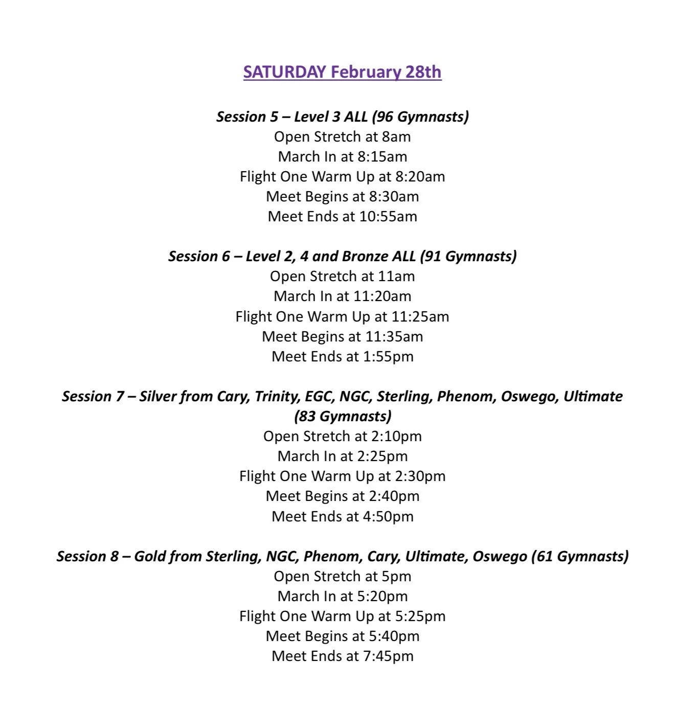 Girls competing Sunday: practice normal days M-F adding one of your off days (attending 4 full practices) off Saturday compete Sunday.) If you have issues with making the exta day during the week reach out to Coach Shannon for run through option on Sat. 2/14.