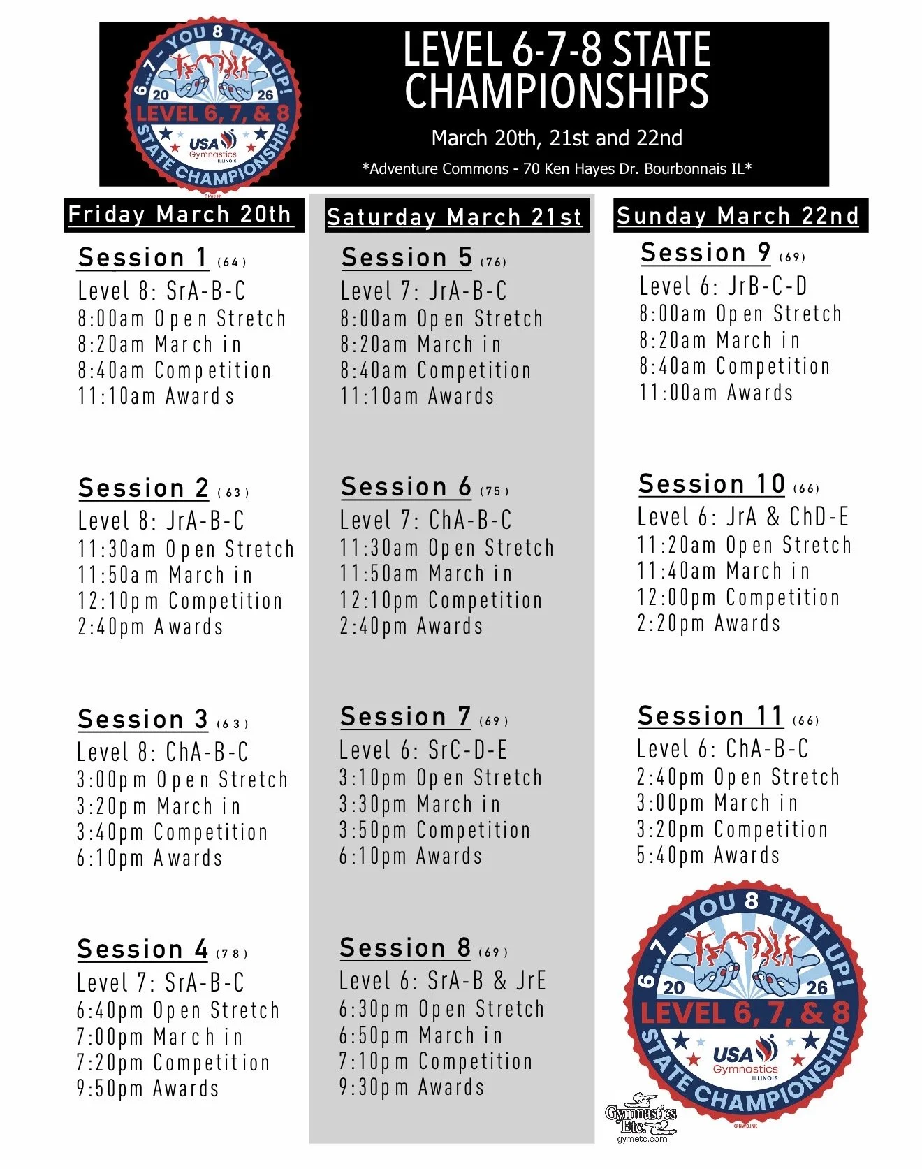 Level 6 -9 4 & 5 day a week gymnasts: M,T,W normal practice optional run through practice Th 4-6pm compete Fri.