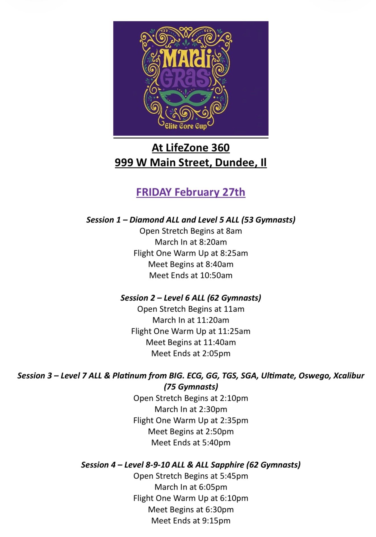 Practice Changes for girls in the MEGA/ELGIN MEET week of 2/9-2/14 Note: if your gymnast has a modified schedule for her level, or you have a conflict, reach out to Coach Shannon for info/alternative.